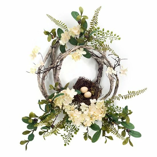 With a rustic look, this Melrose Artificial Hydrangea & Bird Nest Wreath 2-piece Set is the perfect addition to your home decor.