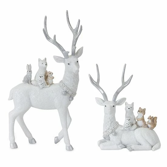 Create a cozy Christmas atmosphere when you decorate with this Melrose resin deer decor set.
